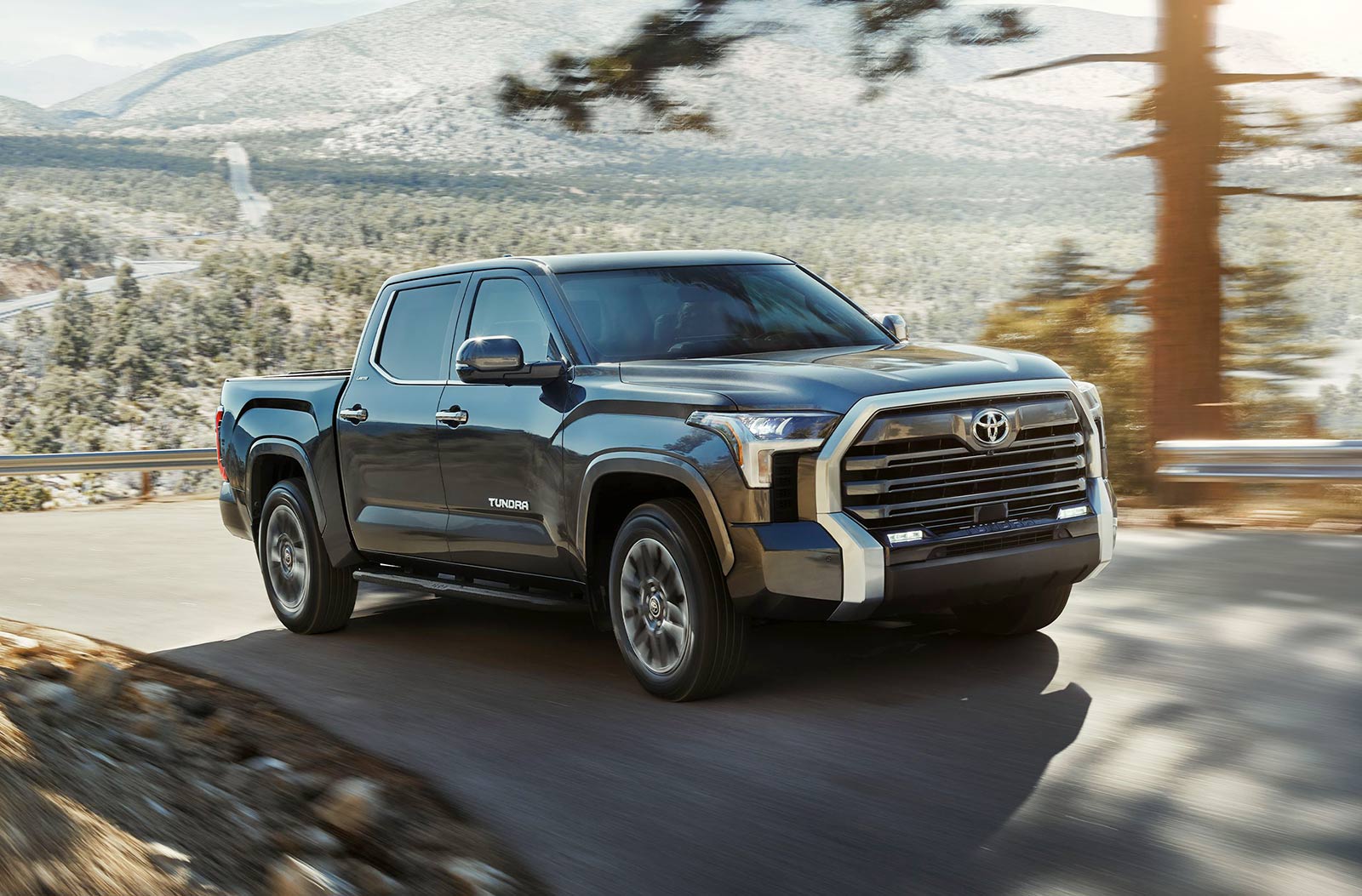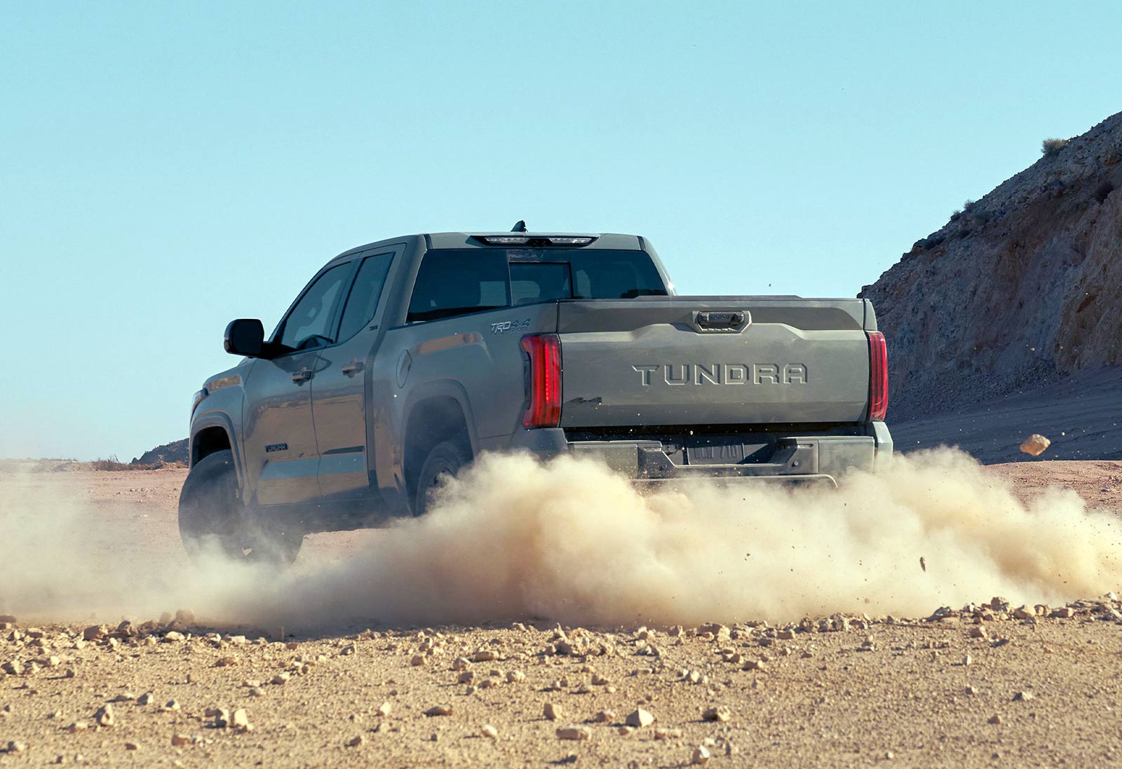 Walkaround: The Toyota Tundra follows the current design trend of big, angular body cues with exaggerated fenders, hood bulges and grilles that would be at home on a semi. The lined 5.5-foot bed had a power source, excellent lighting and notches for cross-boards and other cargo aids. Tailgate operation was light and easy. The 20-inch, all-terrain tires were more highway friendly than rock-crawling aggressive, which provided a pleasant ride. The lifted suspension was reasonable enough that no ladders were necessary for cab access. Large grab handles helped.